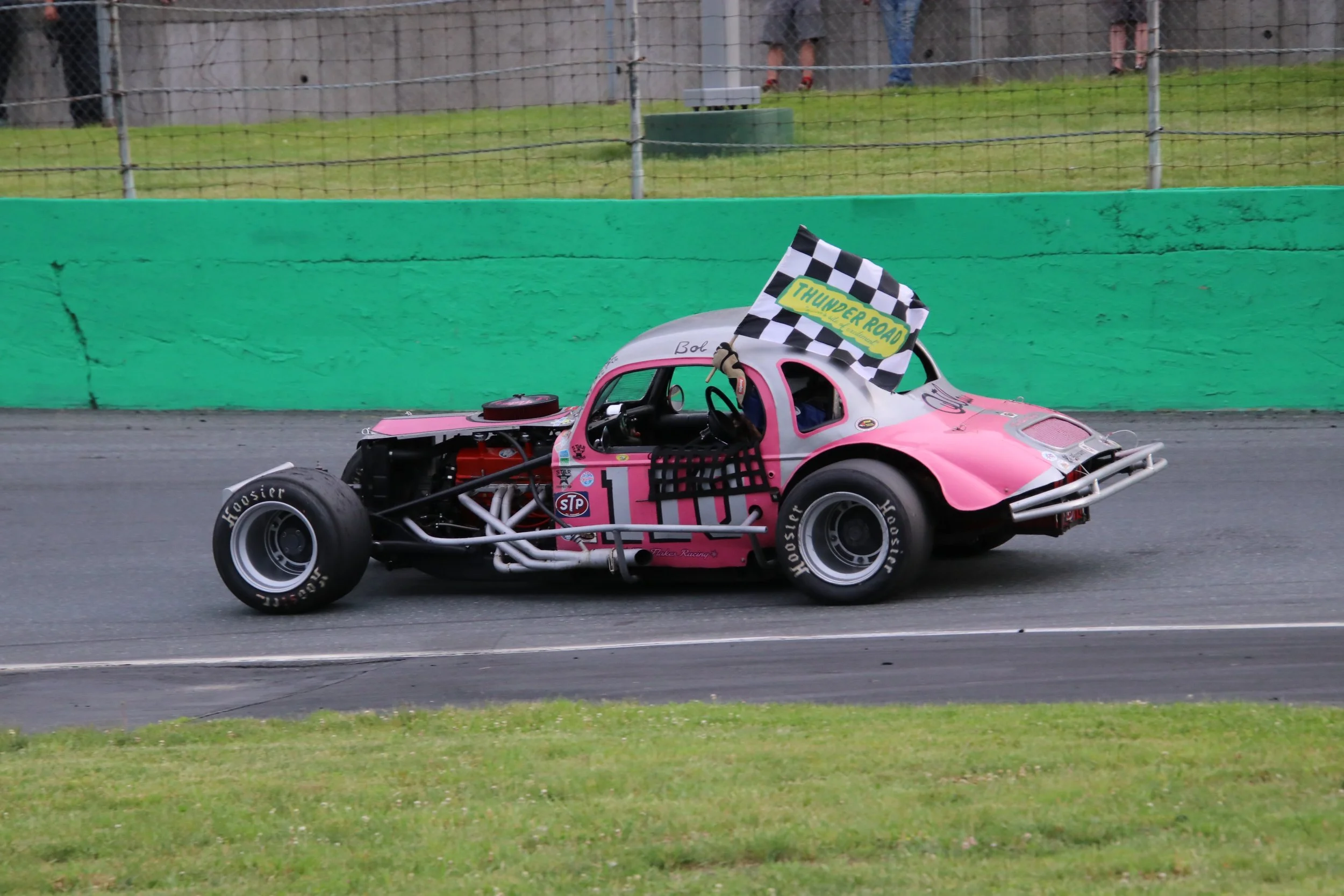 The New England Antique Racers started the night off early in attempt to outrun the threating clouds with 18 coupes, early modifieds and outdated late models making two fields for their annual visit in two caution free events. Mike Rollins in the #44MA took the Sportsman win while Curt Snow in the #110 took the Modified win along with the Cho Lee Memorial Award. Cho Lee was a longtime researcher, statistician and historian for stock car racing in the state of Vermont, particularly for Thunder Road. We are honored NEAR gave out his annual Memorial Award last night at The Road.