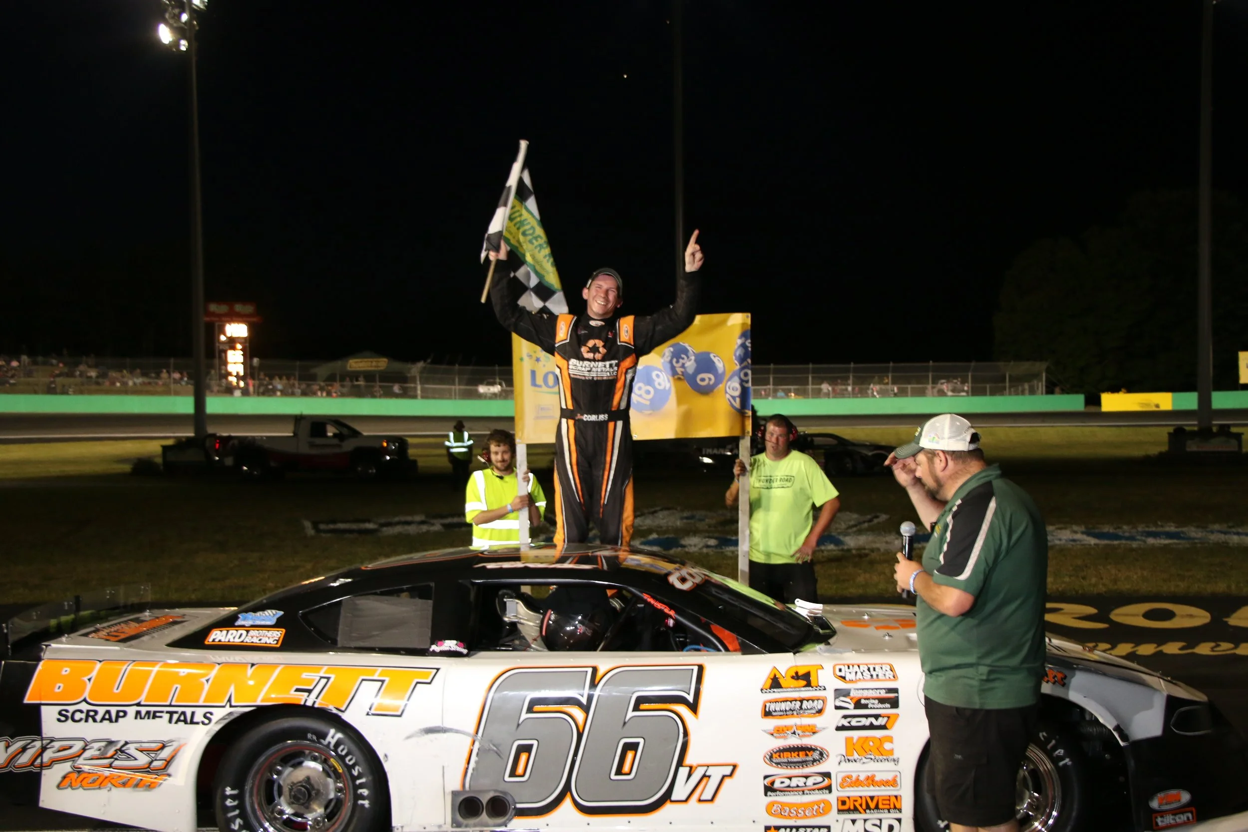 /Barre, VT — Even after taking a restful partial season in 2022, three-time ‘King of the Road’ Jason Corliss returned to his roots at Barre’s Thunder Road and once again stood victorious before the large crowd on hand for the 43rd Vermont Governor’s Cup presented by the Vermont Lottery. Waterbury Center’s Tanner Woodard and Williamstown’s Josh Lovely also made the thrilling trip to Thunder Road victory lane.