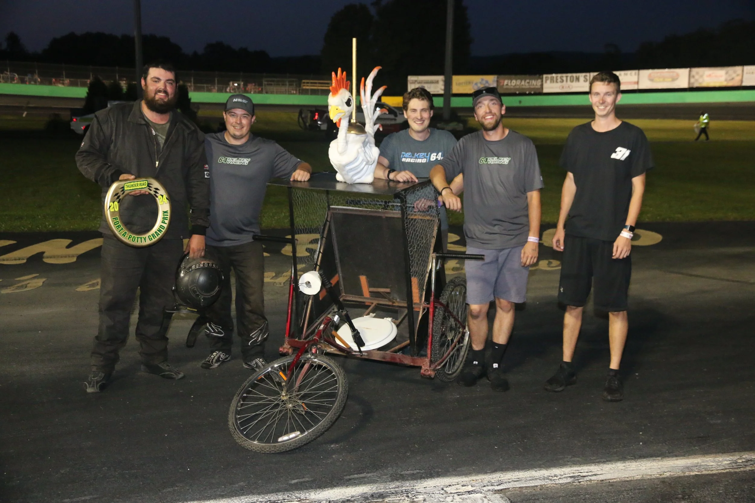 The WDEV/Calkins Portable Toilets program began with the World Famous Port-a-Potty Grand Prix following qualifying action. In a near photo finish, the Road Warrior entry piloted by ‘the Frickin Chicken’ Brodie Frazier narrowly edged out point leaders Brandon Gray, Kaiden Fisher and Dean Switser Jr. to claim the coveted Golden Toilet Seat!