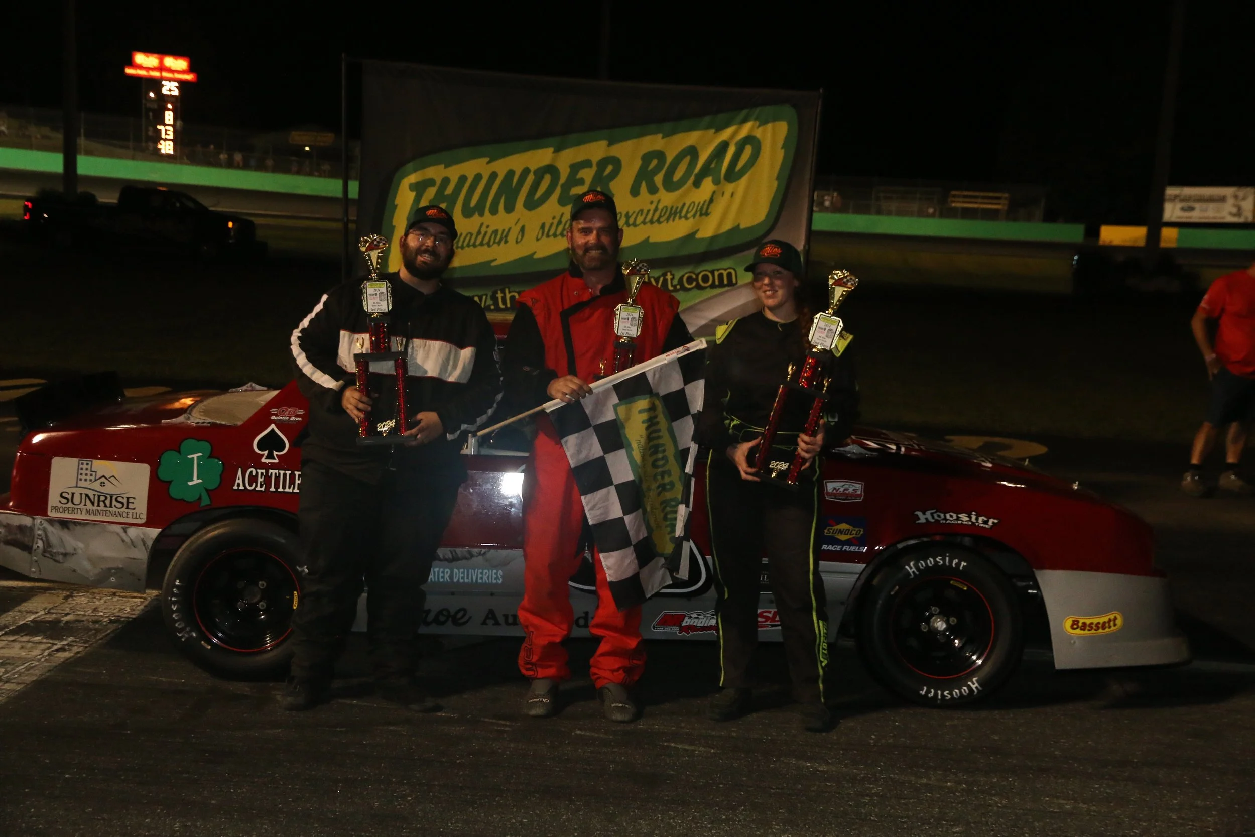 Barre, VT — The night all Vermont race fans look forward to at Barre’s Thunder Road began with a bang in a pair of rain-delayed Times Argus Midseason Championship features. The Maplefield/Irving Late Models took to the highbanks to start the night with their 75-lap, double points affair. A rough and tumble beginning saw Cody Blake set sail early with a mirror full of Stephen Martin. While Blake won the battle, young Kaiden Fisher won the war, maintaining the point lead and driving up from fifteenth on the grid to a third-place finish behind second-place runner Stephen Martin. The Burnett Scrap Metals Road Warriors showed up the Late Models with a green-to-checkers extra-distance run that saw Dan Garrett take his first feature win with Brodie Frazier and Burt Duffy on the podium.