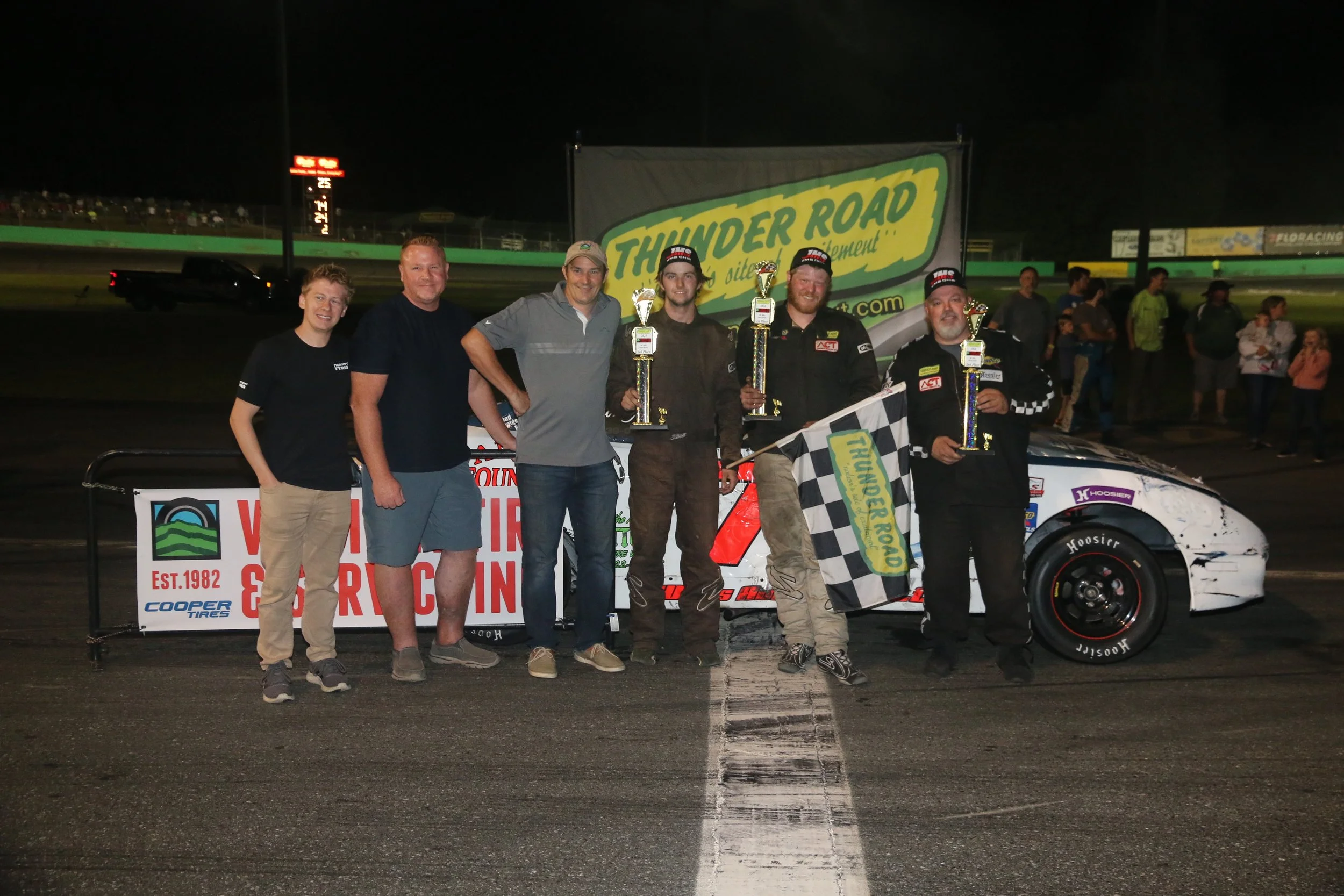 /Barre, VT — The Lenny’s Shoe & Apparel Flying Tigers got the show started on Thursday with their rain-delayed second round of the Myers Container Service Triple Crown. The extra-distance affair began as front-row starters Cameron Ouellette and Brendan Moodie battled hard in the opening circuits, Moodie taking the early lead. Two-by-two three rows deep behind them saw a spirited battle between a six-pack of heavy hitters, riding it out in the early stages and waiting for the perfect opportunity to pounce. Triple Crown point leader Sam Caron would bite the dust on lap 23 with a broken right-front suspension component sending him into the turn one wall with Adam Maynard and Matt Ballard piling in. After leading from the restart, Brendan Moodie would dominate his way to Myers Container Service victory lane with Jason Pelkey in second and Logan Power just barely edging Cameron Ouellette at the line for third.